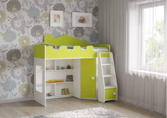 Отличительной особенностью данной модели является наличие прямой лестницы с дверкой, что добавляет элемент игры и позволяет ребенку легко и безопасно подниматься на свое спальное место. Угловой шкаф, расположенный на одном из фасадов кровати, предоставляет достаточно места для хранения одежды, игрушек и других предметов, которые должны быть под рукой.